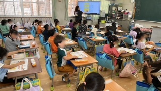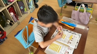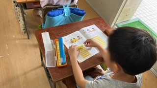 算数の学習です。ブロックを7個にするのに、最初2個あったら後何個いるのかを考えていました。実際にブロックを操作して考えました。最初2個の場合ができたら、次に最初3個の場合、1個の場合を考えます。