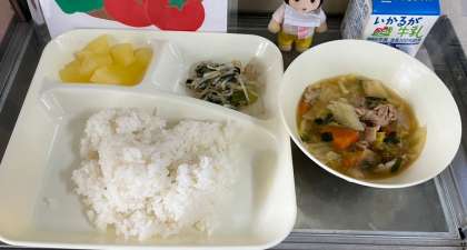 今日の献立は、中華煮、チンゲンサイともやしの生姜和え、りんご(カット缶)、ご飯、牛乳です。いただきます。