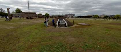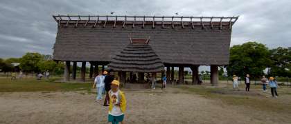 弥生文化博物館につきました。施設内の屋外に高床式倉庫や竪穴式住居のレプリカがあります。それらを見学して回っています。班活動です。