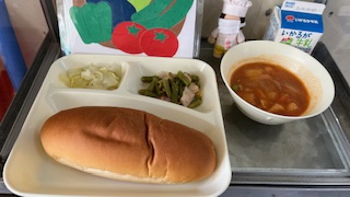 今日の献立は、ケチャップ煮、ベーコンと三度豆のソテー、キャベツのバジル風味サラダ、黒糖パン、牛乳です。とてもおいしそうです、いただきます。
