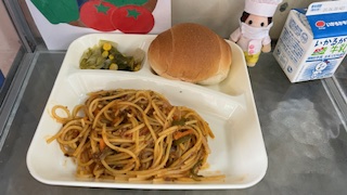 今日の献立は、ミートソーススパゲッティ、レタスとコーンのサラダ、芋けんぴフィッシュ、ミニコッペパン、牛乳です。いただきます。