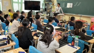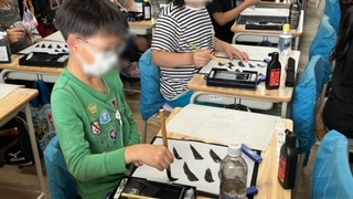 毛筆習字の学習です。はらいの部分の筆の使い方を何回も練習していました。
