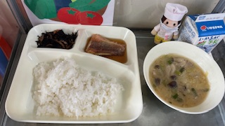 今日の献立は、赤魚の醤油だれかけ、豚汁、ひじきの炒め物、ご飯、牛乳です。いただきます。