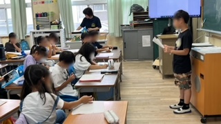 国語の学習で「自分の説明文をつくろう」の単元です。自分の説明文を友だちに発表していました。自分のここを知ってもらいたいというところがしっかり書けていました。発表も上手でした。