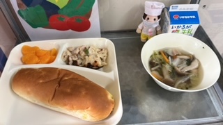 今日の献立は、マカロニグラタン、キャベツのスープ、みかん(缶)、おさつパン、牛乳でした。ごちそうさまでした。