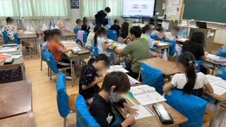 算数の学習です。ものの長さの学習です。身の回りのものの長さを予想し、実際に測ってみて比べる活動をしていました。