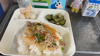 今日の献立は、豚丼、きゅうりの梅風味、白玉団子(きな粉)、牛乳です。いただきます。