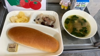今日の献立は、金時豆の中華おこわ、中華スープ、パインアップル(カット缶)、コッペパン、バター、牛乳です。しっかり食べて午後からの活動も頑張りましょう、いただきます!