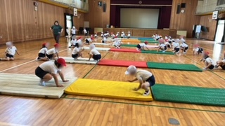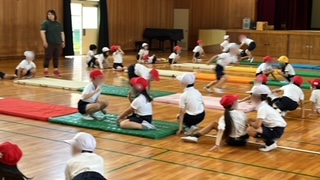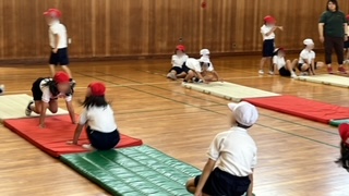 体育の学習です。マット運動あそびをしていました。カエル跳びジャンケンで盛り上がっていました。