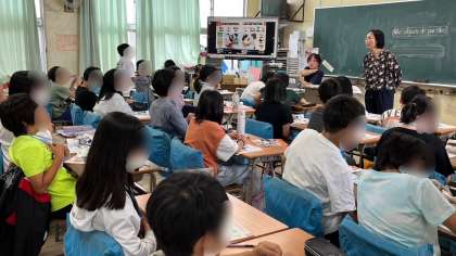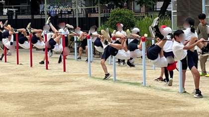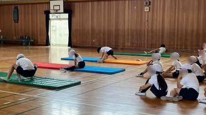 上段は1組、鉄棒運動に取り組んでいました。中段は2組、C-NETとの英語の時間でした。下段は3組、体育館でマット運動、開脚前転の練習でした。