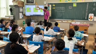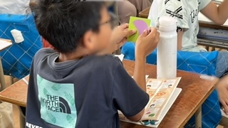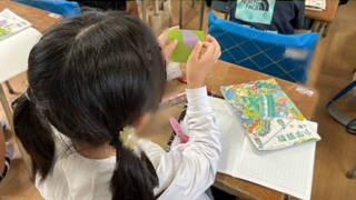 算数の学習で、図形の角についてです。正方形と円の色紙を組み合わせていろいろな角を作って考えていました。