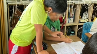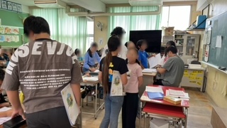 算数の学習です。分数の掛け算についてのまとめをしていました。算数ノートでの問題に挑戦し、できたら先生に確認してもらっていました。あちらこちらで教え合いしている姿もありました。