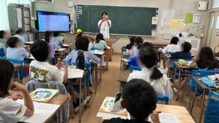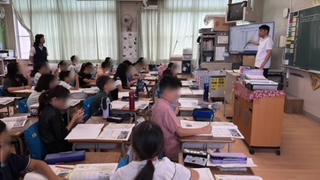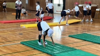 上段は1組、社会科でゴミ問題について考えていました。中段は2組、体育でマット運動をしていました。下段は3組、理科で電流の学習をする際の器具についての説明をしていました。