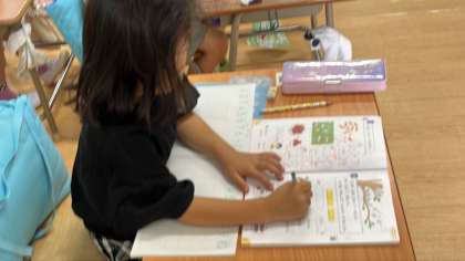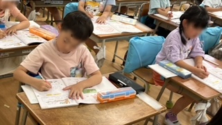 算数の学習です。教科書の問題をみんなで読んで、問題文の中で解くのに必要なワードを考える学習をしていました。