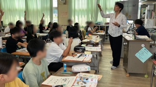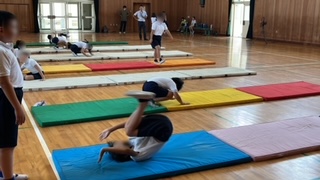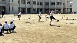 上段は1組、体育館でマット運動でした。中段は2組、C-NETとの英語学習の時間でした。下段は3組、陸上運動のハードル走で後ろにくる足の抜き方を確かめていました。