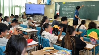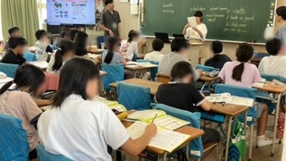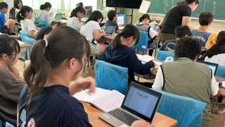 上段は1組、算数の学習で分数の割り算です。中段は2組、C-NETとの英語学習で、好きな食べ物についての発表のようですね。下段は3組、災害に備えての意見文をネット検索を活用して作っていました。
