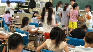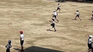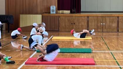 上段が1組、体育館でマット運動、前転の学習でした。中段は2組、算数の3桁の数の足し算・引き算のプリントに取り組んでいました。できたら先生に◯付けをしてもらいます。下段は3組、運動場で陸上運動の学習です。ミニハードルをリズムよくまたぎこしながら走ります。