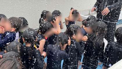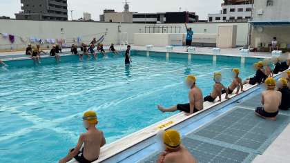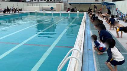 1年生のプール水泳学習の様子です。初めての学習なので、準備体操やシャワー浴び、入水の仕方など、一つ一つ丁寧に説明しながら進めていました。