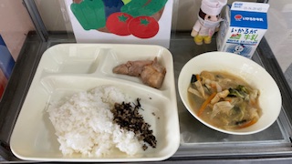 今日の献立は、鶏肉の照り焼き、味噌汁、魚ひじきそぼろ、ご飯、牛乳です。おいしそうですね、いただきます。