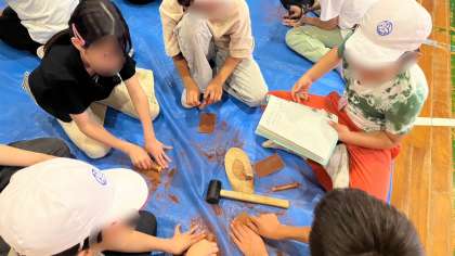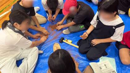一つ目のプログラム、スプーン作りに取り組んでいます。係からの説明を聞いた後、スプーンの柄になる部分の木を磨いています。なかなか大変!