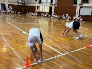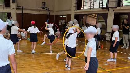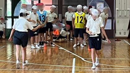 今の時間は室内オリンピックで盛り上がっています。雑巾がけリレーや輪くぐりリレー、ピンポン球運びリレーなどリレー競技に大声援が起こっていました。