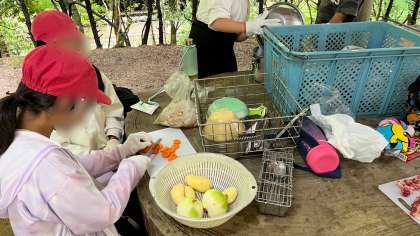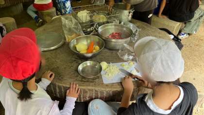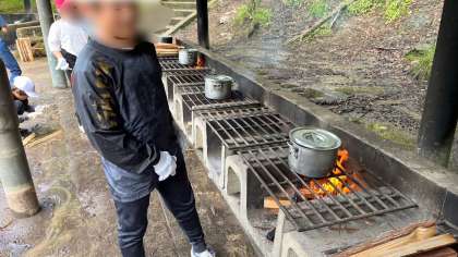 野菜や肉をを切る係、火をおこす係など役割分担して進めています。