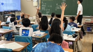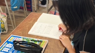 算数の学習です。整数と小数、分数が混ざった式の計算について考えていました。3つの数の種類を一つに統一させてから計算したらいいことに気づいていました。