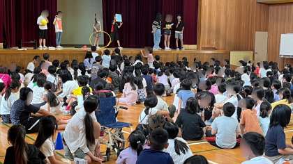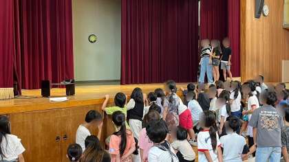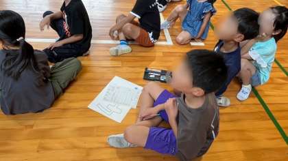 今日は、体育館で「何が通ったでしょうクイズ」をしました。幕の間を通った物を当てるクイズです。どの班も一所懸命に見ていました。通った物は、どれも子どもたちが学校でよく使っている物(フリスビーや探検バックなど)でした。