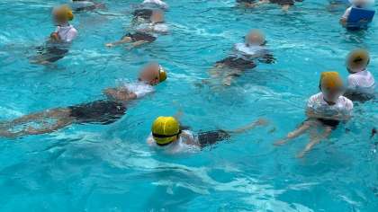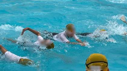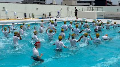 6年生もプール水泳学習で着衣泳に取り組みました。服を着たまま泳いだり浮く工夫をしたり、もしもに備えて体験しました。