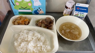 今日の献立は、豚肉の胡麻味噌焼き、すまし汁、切り干し大根の炒め煮、ご飯、牛乳です。いただきます。