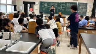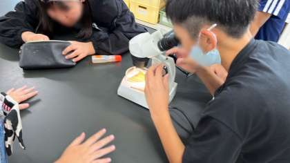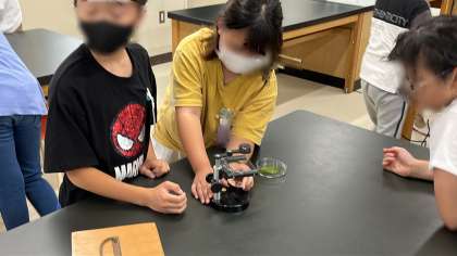 理科の学習です。解剖顕微鏡と双眼実体顕微鏡の使い方を学んでいました。各部の名称やピントのあわせ方など一通り説明の後、実際に葉の表面や髪の毛などを観察してみました。