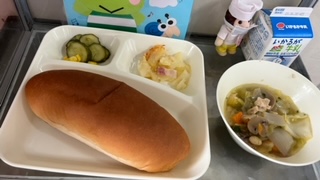 7月最初の献立は、鶏肉とてぼ豆のスープ、ベーコンとじゃがいものチーズ焼き、きゅうりとコーンのサラダ、黒糖パン、牛乳です。