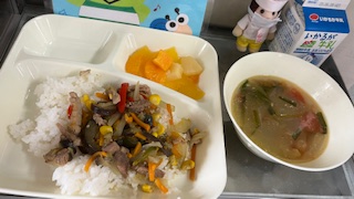 今日の献立は、夏野菜飯、パワースープ、トロピカルゼリー、牛乳です。いただきます。