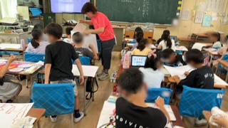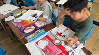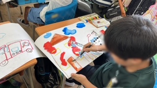 図工の学習で消防車を入れた絵を描いていました。絵の具の色をそのまま使うのではなく、2色以上混ぜて使う工夫をしていました。