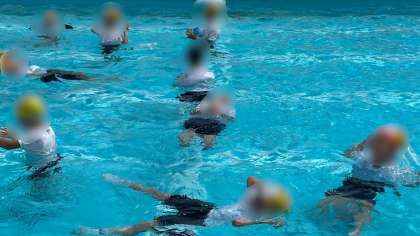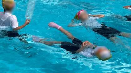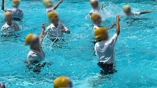 体育のプール水泳学習で、着衣泳をしました。着衣のままでいつものように水慣れの体操をして動きにくさを実感したり、ペットボトルを使って顔を浮かせる方法を知ったりともしもの時の対応について体験しました。