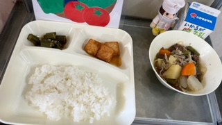 今日の献立は、肉じゃが、厚揚げの味噌だれかけ、オクラのおかか炒め、ごはん、牛乳です。いただきます。
