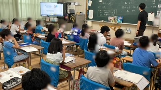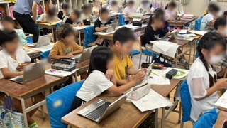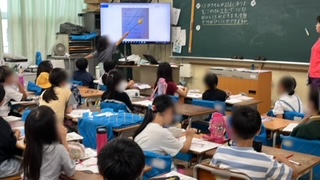 上段は1組、算数の学習で余りのある計算問題に取り組んでいました。中段は2組、理科のプリントをした後、タブレット端末のアプリで理科の問題に取り組んでいました。下段は3組、算数の問題で、自分がどう考えたかを発表するのに、モニターにノートを写し、それを示しながら説明していました。