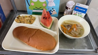 今日の献立は、チキンパエリア、ウィンナーとキャベツのスープ、スイカ、黒糖パン、牛乳です。季節の果物のスイカが出ることを知った給食当番の子どもたちから「やったー!」と歓声が上がっていました。600近い人数分のスイカを切り分けてくださっている調理員さんに感謝していただきましょう♪