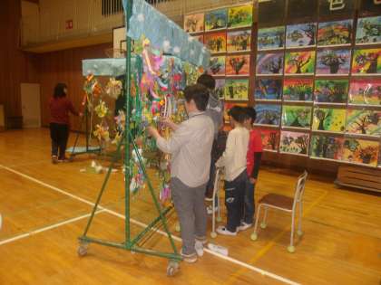 明日からの展示会に向けて今日は各学年が講堂で準備をしました。教室から作品を運ぶ時はそぉっと歩きとても慎重でした。先生たちも作品の配置を考えるなど色々と工夫していました。各学年どれも素晴らしい作品ばかりですのでぜひお越しください。また、生涯学習ルームの「おりがみ教室」の皆さんの作品も展示していますのでぜひご覧ください。