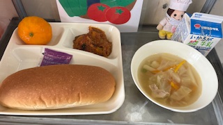 今日の献立は、かぼちゃのミートグラタン、鶏肉と野菜のスープ、冷凍みかん、コッペパン、ブルーベリージャム、牛乳でした。暑いので、冷凍みかんはとても嬉しかったです。ごちそうさまでした。