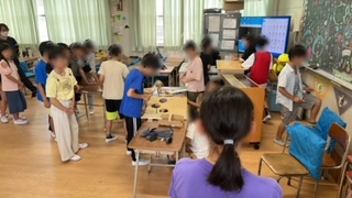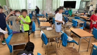 上段は1組、夏休みの宿題の説明をしていました。中段は2組、教室の清掃をしていました。下段は3組、自分たちで作ったゲームを楽しんでいました。