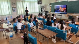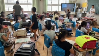 上段は1組、夏休みの宿題についての説明を聞いていました。中段は2組、教室整理で机の中やロッカーの整理整頓をして、荷物を全部まとめていました。下段は3組、お楽しみ会の一環でビデオ鑑賞会をしていました。