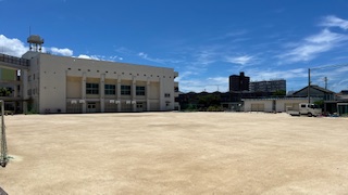 子どもたちの声がしない学校は、強い日差しと青い空の下でも少し寂しげです。