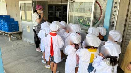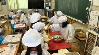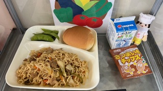 今日の献立は、焼きそば、枝豆、おさつチップス、ミニコッペパン、牛乳です。