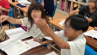 詩の学習です。出てくる言葉を動作化してその情景を捉えていきます。写真は「ぐるぐるまわって」を動作化して隣の子と見合っていました。