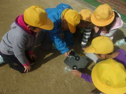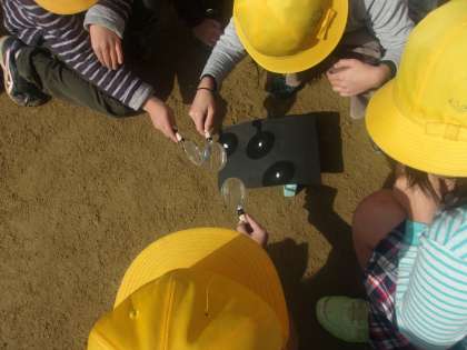 運動場で3年生が理科の学習をしていました。虫眼鏡で太陽の光を集めて黒い画用紙を焦がす実験をしていました。太陽がすごい熱を発しているということがよくわかったかな?