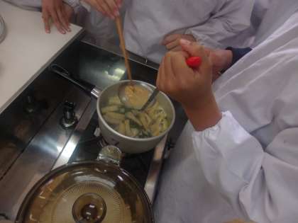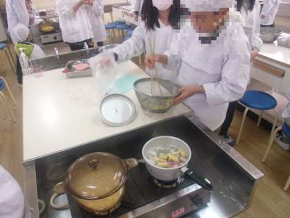 5年生が調理実習をしていました。メニューは「ご飯」と「みそ汁」です。家ではあまり経験できないガラス鍋でご飯を炊きました。みそ汁は豚肉が入っていてとても豪華でした。どちらも普段よく食べるメニューですが、自分たちで作ったので一段とおいしかったことでしょう!