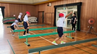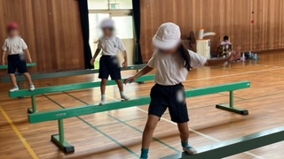 体育の学習です。ラジオ体操をしっかりした後、平均台を使って体を上手く使いバランス良く動く学習をしました。
