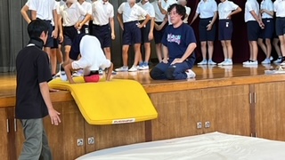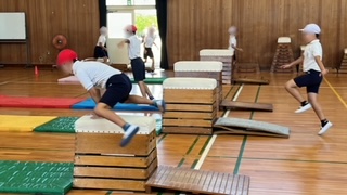 体育の学習です。跳び箱運動で、開脚跳びや台上前転などの練習をしていました。台上前転について、しっかりとまわる感覚を身につけられるよう工夫していました。