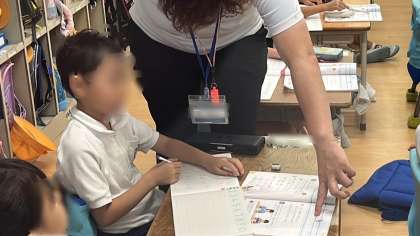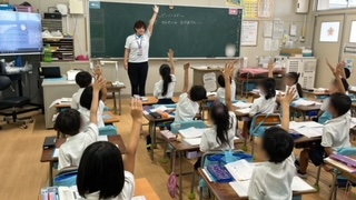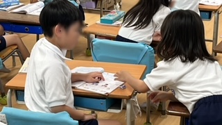 算数で数の線の学習をしていました。印のついた直線上にうさぎや猫、鬼ぼうや(1-1のキャラクターみたいです)がのり、乗っているところの数を答えたり、どちらが何こ多いかなどを考えたリしました。算数でよく使う数直線の基礎です。友だちと相談して考えていました。